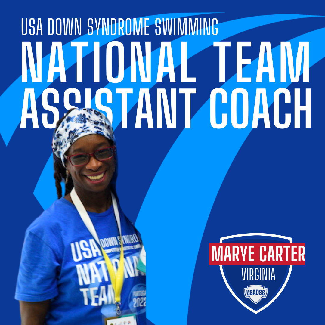Welcome Back Coach Carter! Coach Marye Carter returns as a USADSS National Team Assistant Coach. She has over 40 years in the Aquatics business, including coaching, management, and leadership experience. She is intentional in her support and inclusion of swimmers who have developmental disabilities and has a gift for teaching storke mechanics. Currently, she is an Assistant Age Group Coach for Nation’s Capital Swim Club/J&MSwim, LLC, Alexandria, Virginia.